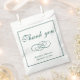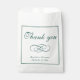 Express your gratitude with these charming wedding favour bags, perfect for leaving a lasting impression on your guests. These white bags feature emerald green text that says "Thank You," offering a vibrant and heartfelt touch. You can further personalise them with the couple's names and wedding date, making each bag a unique keepsake. Ideal for holding small treats or mementos, these favour bags blend seamlessly with your wedding decor, adding a cohesive and thoughtful element to your special day.