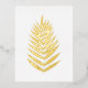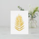 This modern minimalist botanical illustration features a simple palm frond leaf drawing in gold foil and white.