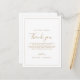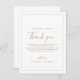 This minimalist gold thank you reception card is perfect for a simple wedding. The modern romantic design features classic gold and white typography paired with a rustic yet elegant calligraphy with vintage hand lettered style. Customisable in any colour. Keep the design simple and elegant, as is, or personalise it by adding your own graphics and artwork. Place these cards at the table setting for each of your guests at your wedding reception. Personalise the card with your names and a special thank you message.