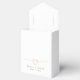 Simple, elegant, minimalist, modern white wedding favour box with bride and groom names, date and gold rope heart.