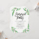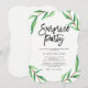 These modern, minimalist style surprise party invitations feature a clean white background with green watercolor leaves and black typography.