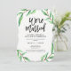 These modern, minimalist style post-wedding ceremony invitations feature a clean white background with green watercolor leaves and black typography.