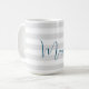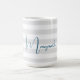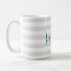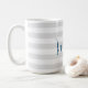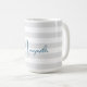 This personalised mug features a minimalist striped pattern in light grey and white with a customisable name or monogram in blue handwriting. The colour of the stripes and font style are customisable in the Design Tool.