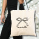 Simple Name Monogram Minimalist Canvas Tote Bag. This cute and stylish tote bag features a large hand-drawn bow at the top, paired with a name in elegant handwritten script calligraphy below. The design is showcased prominently on both sides of the bag for a bold and fashionable statement. Both the bow and the name are currently black but can be customised to any colour to suit your style.