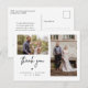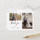 Modern photo wedding thank you card postcard featuring a small and one larger photographs, a modern calligraphy image and heart. The couples message is organized and ready to be edited on the back.