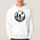 This minimalist black-and-white hoodie design features a silhouette of a hiker exploring a scenic natural landscape. The hiker is equipped with a backpack and trekking poles, surrounded by a tall pine tree, stylised hills, and the sun in the background. Encased in a circular frame, the clean lines and sharp contrast emphasize a connection with nature and the spirit of adventure. This modern, outdoor-themed design is perfect for hiking enthusiasts and nature lovers who appreciate simplicity and bold imagery.