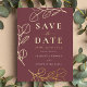 Beautiful simplistic wedding save the date invitation with gold foil eucalyptus leaves sprigs on a burgundy background, a minimalist greenery line art drawing, simple and stylish and perfect for a botanical diy printable wedding save the date download or modern printed wedding save the date. Easy to use templates with gold foil and white elegant typography script on a burgundy background. Unique artist created custom wedding save the date magnet to remind friends and family to keep the date free. A minimalistic foliage on dark red wedding save the date invite design. Original artwork by artist Catherine Sweetman
