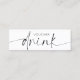 Minimalist free drink vouchers in an elegant black and white design, featuring calligraphy script font which reads 'drink'. Add your logo, slogan and website to the back to make your custom business event drink vouchers.