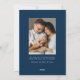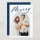 Modern Christmas photo card featuring "Merry" displayed in a bold navy script at the top of the design with a white background. Your vertical photo is displayed inside an arch frame. Personalise the front of the photo Christmas card with your family name and year. The back of the simple holiday card features an additional photo with space for your personal message.