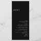 Elevate your reception with this Personalised Minimalist Modern Black Wedding Menu. Designed to highlight your cuisine, this elegant piece enhances any wedding menu display. Perfect for couples seeking chic wedding menu ideas, these customisable wedding menu cards complement stylish wedding menus at a black wedding or black and white wedding. A timeless design that adds sophistication to your table setting while guiding guests through the evening’s dining experience.