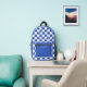 This backpack features a trendy chequerboard pattern in blue and white. The colours are fully customisable in the Design tool. Personalise it with name in white on blue front pocket.