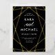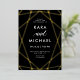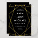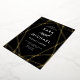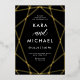 This stylish wedding invitation features a gold foil, modern geometric design on a dark, moody black background with elegant calligraphy.