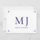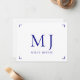 A simple elegant minimalist modern monogram with initials and name, navy blue type on white note card with a simple bracket border. White on the back for writing notes.