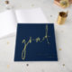Minimalist Modern Script Grad Graduation Navy Blue. Simple elegance, Grad is in an elegant set script, and the rest of the text on the front, back and spine you can easily personalise. All the words are printed in real foil in your choice of gold, rose gold or silver for a glam luxury touch.
