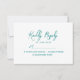Minimalist, modern white and teal wedding response card with gold rope heart at the back and simple handwritten calligraphy script.
