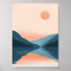 Minimalist Pastel Lake and Mountain Poster. a nature poster in pastel hues with lake, mountain and a sun scenery.