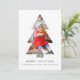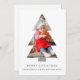 This minimalist holiday card will easily crop your photo into the shape of a Christmas tree. It makes a beautiful, simple silhouette that will stand out from the crowd. It is recommended that you use a photo with the subject centred, and extra space both horizontally and vertically to allow it to fill the tree. You may customise and change the colours for any element of this card, including the text and the little tree graphic on the back.