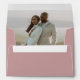 Modern dusty rose pink wedding envelope featuring a simple design with your names in an elegant script typography and your return address in a minimalist sans serif font. The inside has your favourite photo. This chic wedding envelope is perfect for a spring or summer wedding.