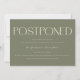 Postponing a big event like your wedding can be stressful, but you can still look stylish with this modern and minimalistic change of plans template card. It says "postponed" in stylish and noticeable font at the top followed by your event information and regrets. The background is sage green.