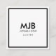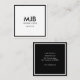 A square double sided black and white business card. The front shows a white background with a black border, a monogram, your name and title, the back si in inverted colours shows contact and information on black background