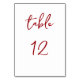 Help your guests find their seats with this elegant red and white table card. The letters and numbers are in a script font.