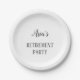 This minimalist retirement paper plate is perfect for an elegant retirement party or classy reception. The design features dark grey calligraphy with contrasting simple typography. You can customise these party plates by changing the background and wording to any colour, or by adding your own graphics and artwork. Personalise the plates with the name of the retiree.