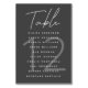 This chic and modern wedding seating chart table number card features a dark grey background with script lettering in white. Personalise it for your needs. You can find matching products at my store.