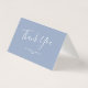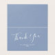 A simple wedding thank you card featuring the phrase "thank you" in white hand lettered font, and your names and wedding date in modern sans serif font on a dusty blue background. The card is blank inside for your own hand written message.