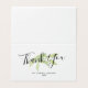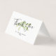 A simple wedding thank you card featuring the phrase "thank you" in black hand lettered font, overlaying a green watercolor branch, and your names and wedding date in modern sans serif font. The card is blank inside for your own hand written message.