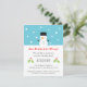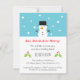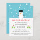 A modern and minimalist Christmas party invitation for friends and family! The invite comes with a little snowman that has a carrot nose and a black top hat. The snowman is sitting on a blue background with falling snow. Personalise easily with your party details in space provided with mistletoes as decorations.