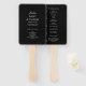 The Minimalist Stylish Black Wedding Program Hand Fan features a sleek black background with elegant white and grey text. A modern and practical touch for your wedding, combining style and function. Easy to customise.