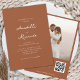 Surprise your loved ones with this elegant wedding invite, featuring terracotta rust background, custom photo, text & qr code of your choice. Easily add your own details by clicking on the "personalise" option.