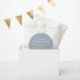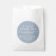 Elegant, modern, minimalist dusty blue wedding thank you favour bag with gold rope heart and simple calligraphy script.