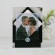 This modern wedding invitation card features a clean, minimalist design printed on transparent acrylic, showcasing a full-colour photograph of the couple as the backdrop. The wedding details are elegantly written in a white serif font, centred for a sophisticated look. The card is complemented by a black envelope, sealed with a silver wax monogram for an upscale touch. Perfect for couples looking to blend personal elements with formal and contemporary style, this invitation exudes a sense of modern luxury and refinement.