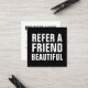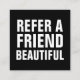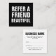 A trendy, minimalist, modern, simple black and white referral card with the text: Refer a friend beautiful.