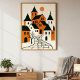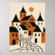 This minimalist orange and black village illustration with charming mediaeval style houses, pointed rooftops and a winding cobblestone street under a warm sun. With its rustic and abstract style, this artwork makes a wonderful seasonal gift for autumn celebrations, Halloween, Thanksgiving and festive occasions, bringing a cosy yet mystical touch to any space.