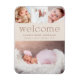 A modern gender neutral birth announcement magnet to announce the arrival of your newborn baby boy or baby girl. The simple design features welcome in a simple font with a four photo collage. Personalise with baby's name, birth date, birth stats and parents names.