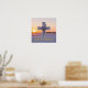 Minimalist white cross adorned with lavender sprigs and a gradient sunrise backdrop