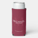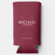 This can cooler features personalised groomsman's name with title and wedding date in white and monogram in light burgundy red as background, in classic serif font style, on burgundy red background.