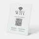 Make Wifi access easy and stylish with this Black Wifi Password Sign with QR Code Pedestal Sign on white background. Perfect for Airbnb, VRBO, homeaway hosts, vacation rentals, short-term rental house, guest rooms, cafés, salon, studio and offices, this minimalist Wi-Fi desk sign helps guests connect quickly.