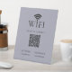 Make Wifi access easy and stylish with this Black Wifi Password Sign with QR Code Pedestal Sign on muted blue background. Perfect for Airbnb, VRBO, homeaway hosts, vacation rentals, short-term rental house, guest rooms, cafés, salon, studio and offices, this minimalist Wi-Fi desk sign helps guests connect quickly.
