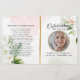 Customise this modern, elegant funeral program with your own photo and text to create a special tribute to your Beloved. An 'In Loving Memory' program featuring Floral Foliage botanical and gold accent memorial program. On the front cover is a photo of your loved one, their name, dates, the memorial venue, and the date of the event. On the inside is an obituary and order of service, and on the back is a thank you note and the venue of the