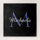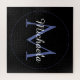 Minimalistic blue circle modern monogram with blue initial and white name on black. Personalizable custom name with a serif initial behind on a black colour.