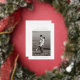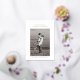 The save-the-date photocard features a single, centred photo of the couple. Above the photo, their names are displayed in a clean, modern font. A minimalistic save the date is written in foil on top of the couple's name. Below, the wedding date and location are neatly written. The design is minimal with plenty of white space, focusing on simplicity and elegance.