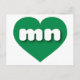 This postcard features an eco-friendly green heart containing the bold, white, rounded, lower case letters mn, a playful abbreviation for Minnesota, the north star state. The reverse side of the postcard is blank, awaiting your customised text or handwritten sentiments.