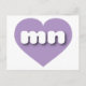 This postcard features a lavender heart containing the bold, white, rounded, lower case letters mn, a playful abbreviation for Minnesota, the north star state. The reverse side of the postcard is blank, awaiting your handwritten sentiments or customised text.