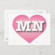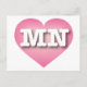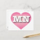 This postcard features a calm, cool, and collected pink heart with a white washed centre containing the bold, white, upper case letters MN, the official abbreviation for Minnesota, the north star state. The reverse side of the postcard is blank, awaiting your handwritten sentiments or customised text.