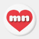 This magnet features a vibrant red heart containing the bold, white, rounded lower case letters mn, a playful abbreviation for Minnesota, the North Star state.