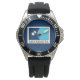 Has heft and feel of expensive stainless steel quartz wrist watches. Solid construction and good looks. Although it had a really top quality rubber strap, I substituted a stainless steel "Shark" style mesh strap, which I think is the most comfortable strap available. Perfect. True colors of original image. Clear, crisp image precisely aligned and spaced.