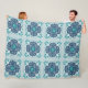 A geometric boho fleece blanket with a mint, aqua, navy blue, and turquoise mandala tile.